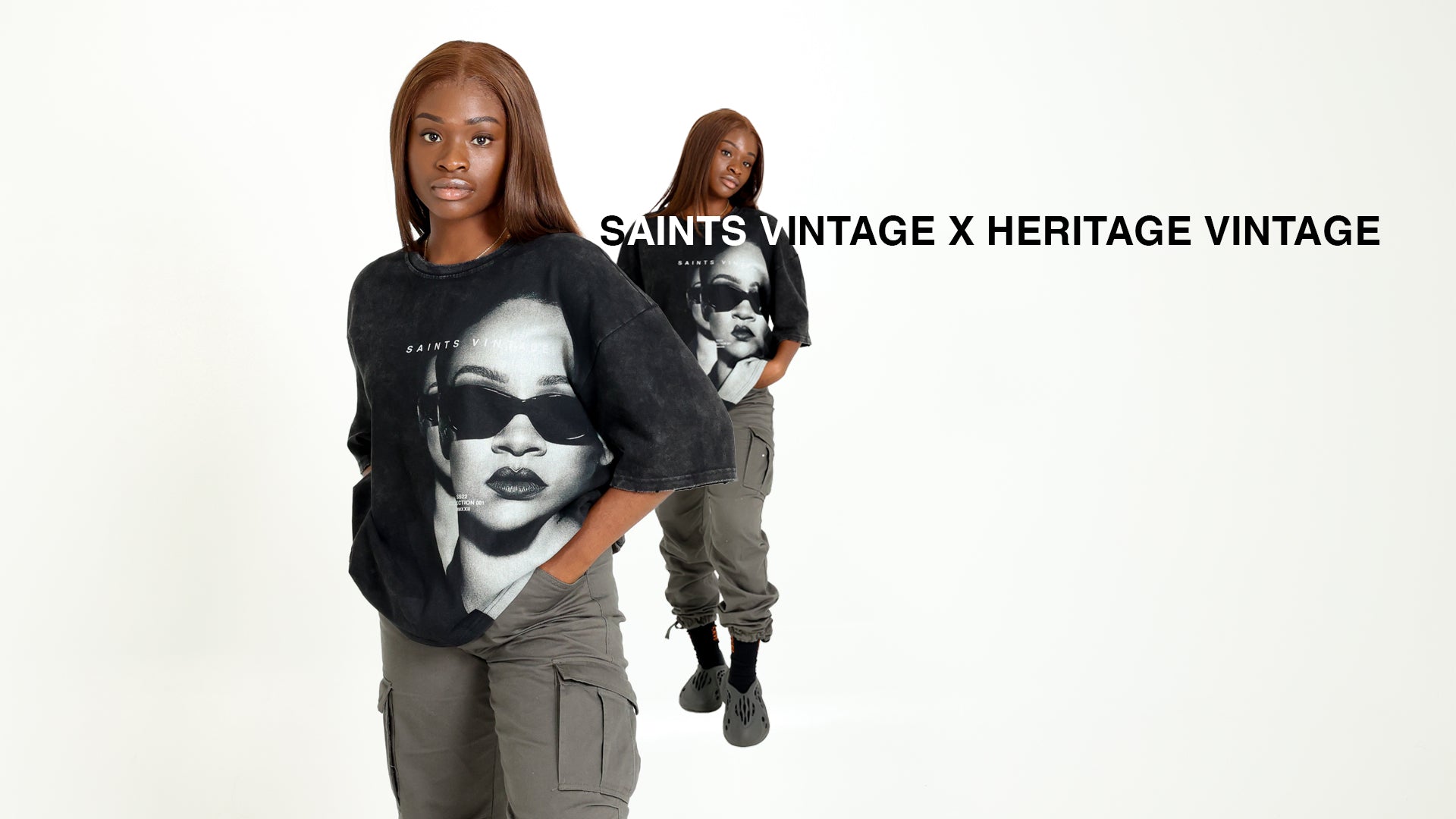Saints vintage washed black t-shirt. This product is made from one of the best garments. Acid wash and slightly oversized for the ultimate luxurious streetwear feel. Rihanna graphic print on the front with Saints Vintage orange label at the bottom right of the shirt